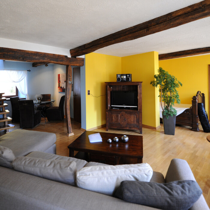 - Ein gemütliches Wohnzimmer mit komfortablem Sofa und + Chaiselongue sowie ein separates, großzügiges Schlafzimmer